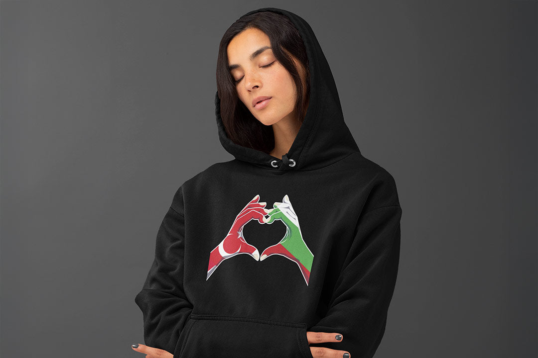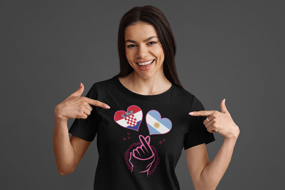 Create your own story with the Heart of Two Hands customizable T-shirt. This design features two hands forming a heart, each hand personalized with the flags of your choice. Add a quote that resonates with you, making this T-shirt a unique expression of who you are.